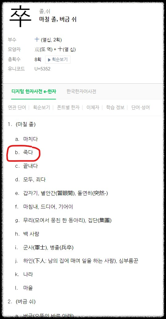 두 단어의 가운데 자인 졸( 卒 ) 자의 뜻을 봐보겠습니다.