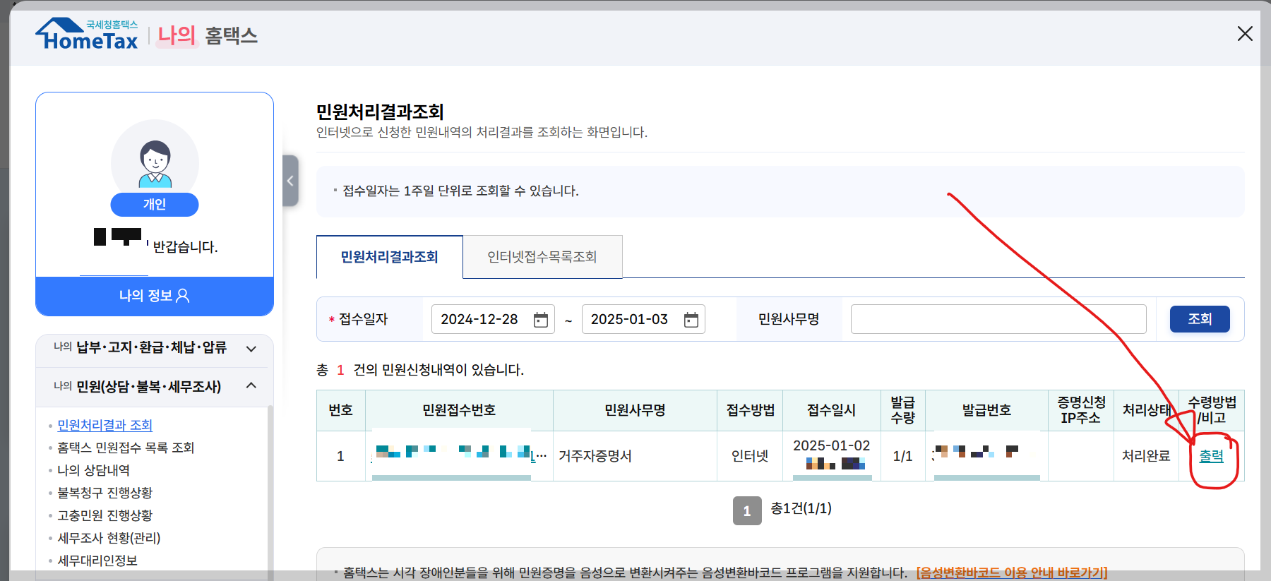 하. 승인 문자 받고 나서, 홈택스 > 민원처리 결과조회에서 출력 누릅니다.