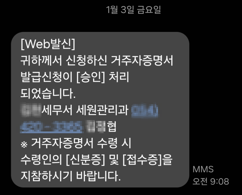 인터넷이나 유튜브에 3일 정도 걸린다고 나와 있는데, 저는 1월 2일에 신청해서 1월 3일 오전에 문자가 왔습니다.