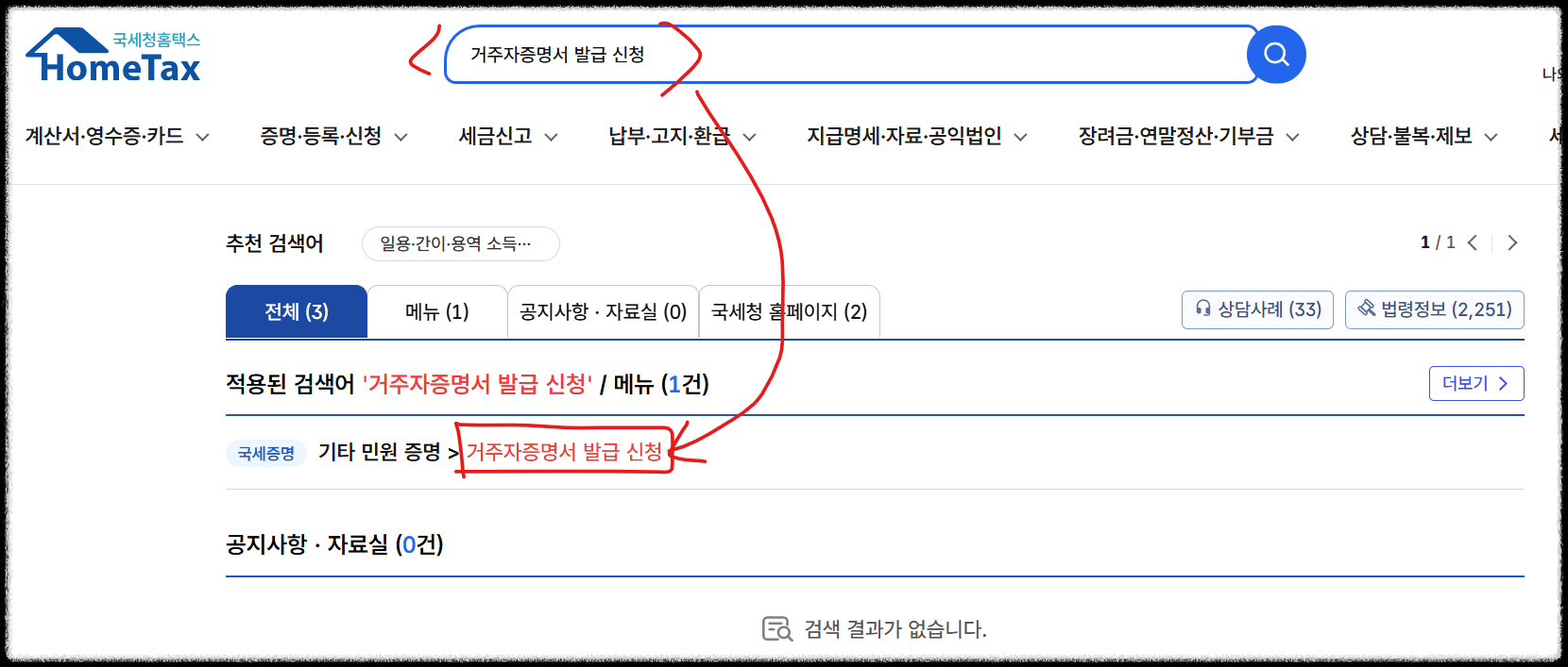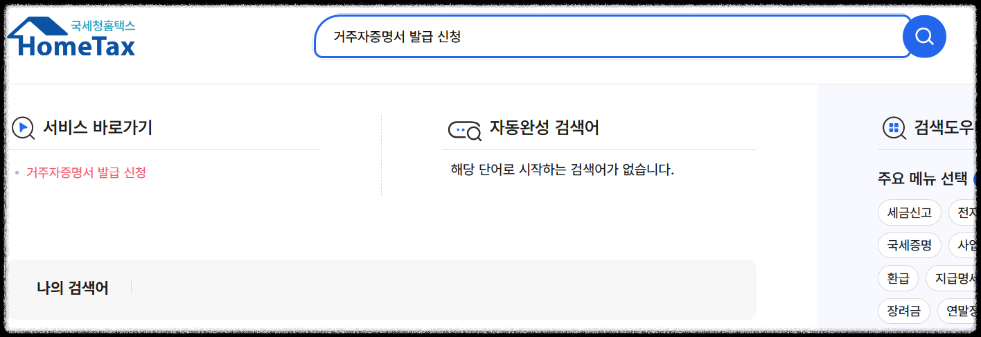 나. '거주자증명서 발급신청'이라고 홈택스 검색창에 치고 엔터키 누르거나 우측 돋보기 버튼 클릭합니다.