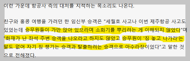 아래와 같이 "승무원이 탈출하라는 말도 없이 소화기나 뿌리려고 했다"는 증언이 당시 승객들로부터 나오고 있습니다.