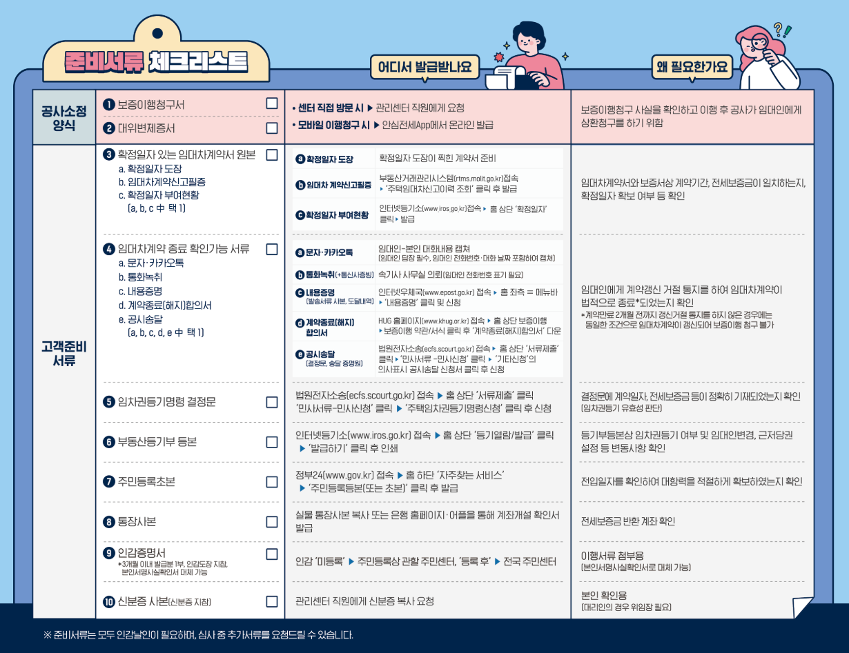 Action: 아래 제반 서류를 챙겨서 보증보험회사(ex. HUG 주택도시보증공사)에 이행청구 접수를 합니다.