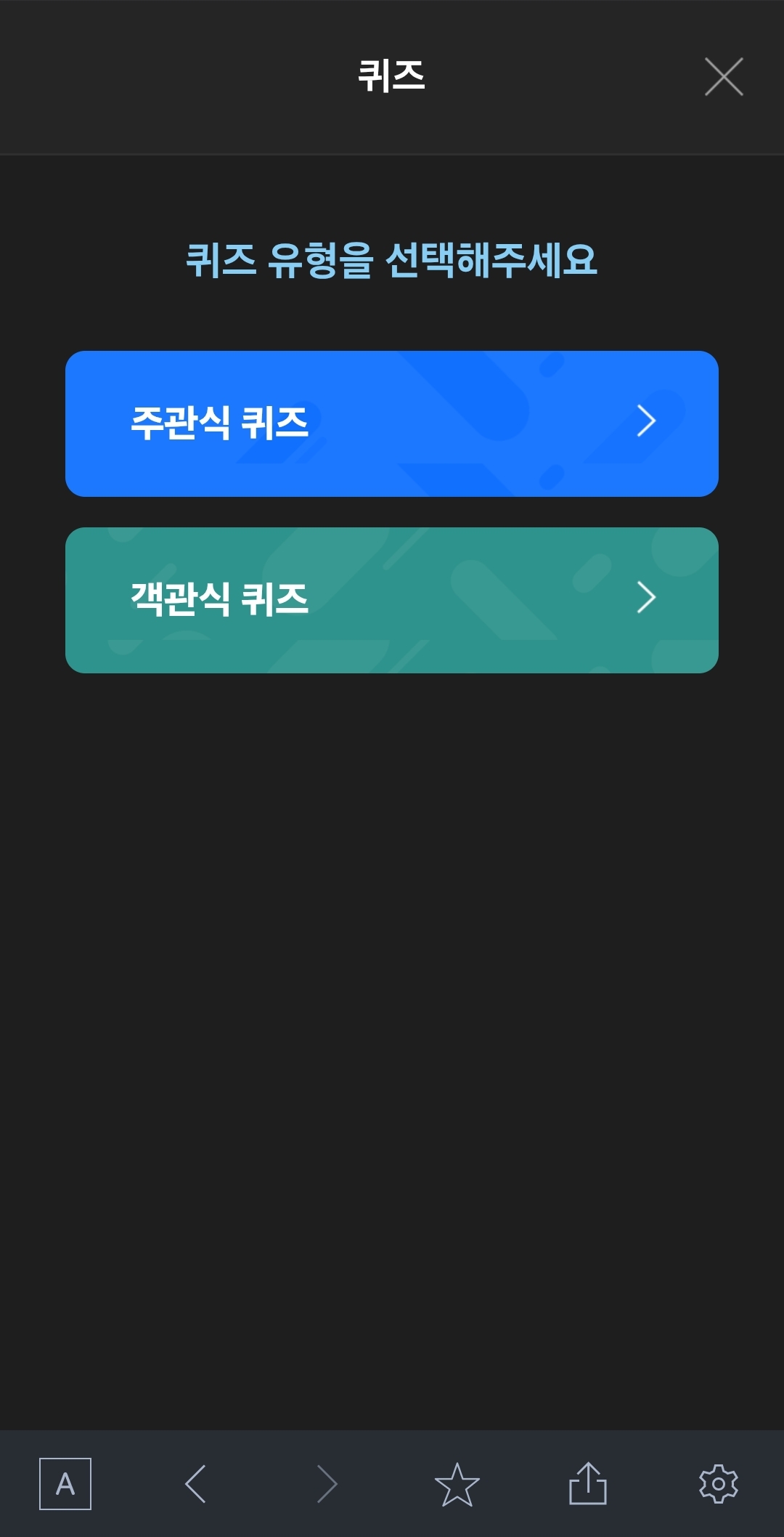 주관식, 객관식 선택하고, 퀴즈를 봅니다.