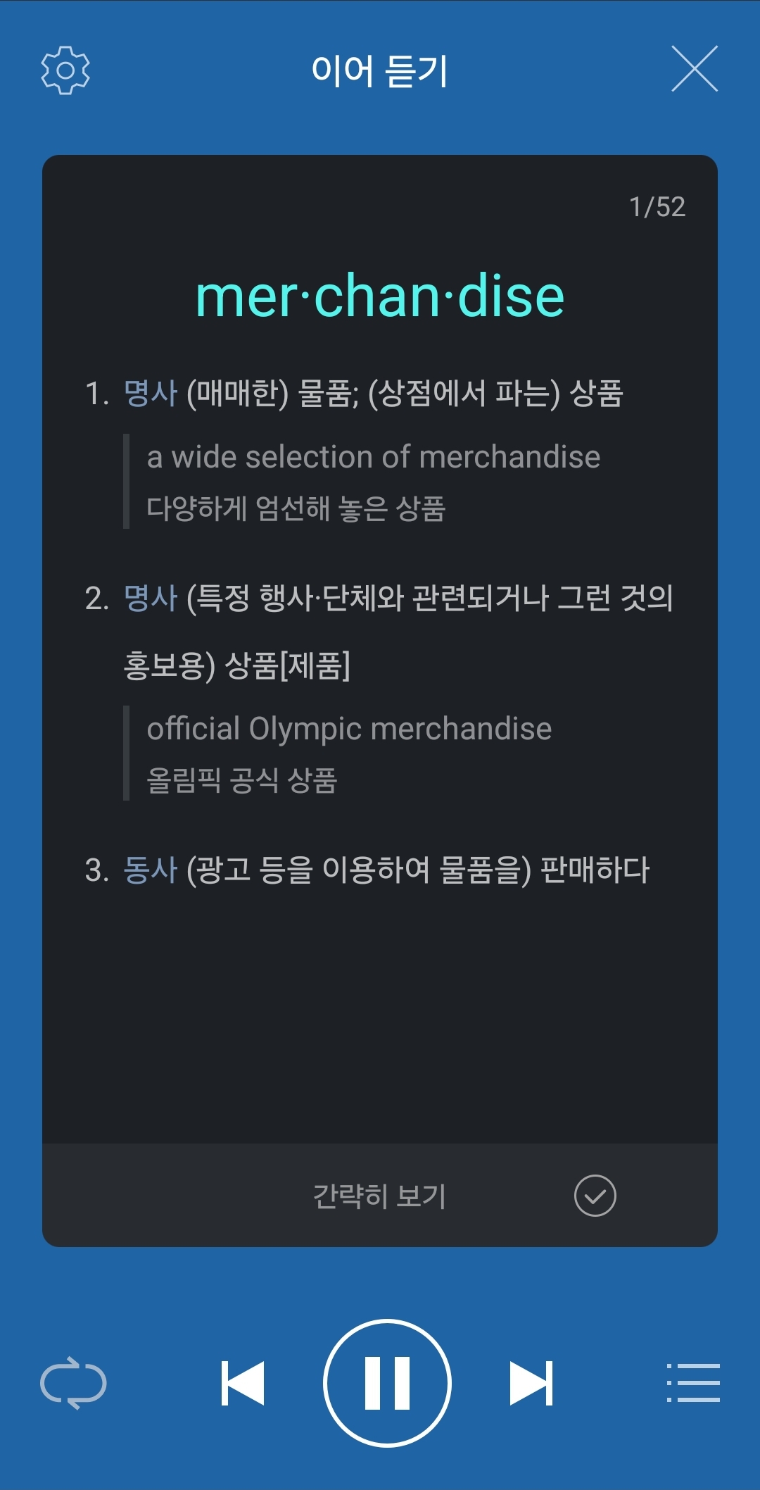 - 플레이 버튼: 저장된 53개 단어를 영어단어, 뜻, 예문을 읽어줍니다.