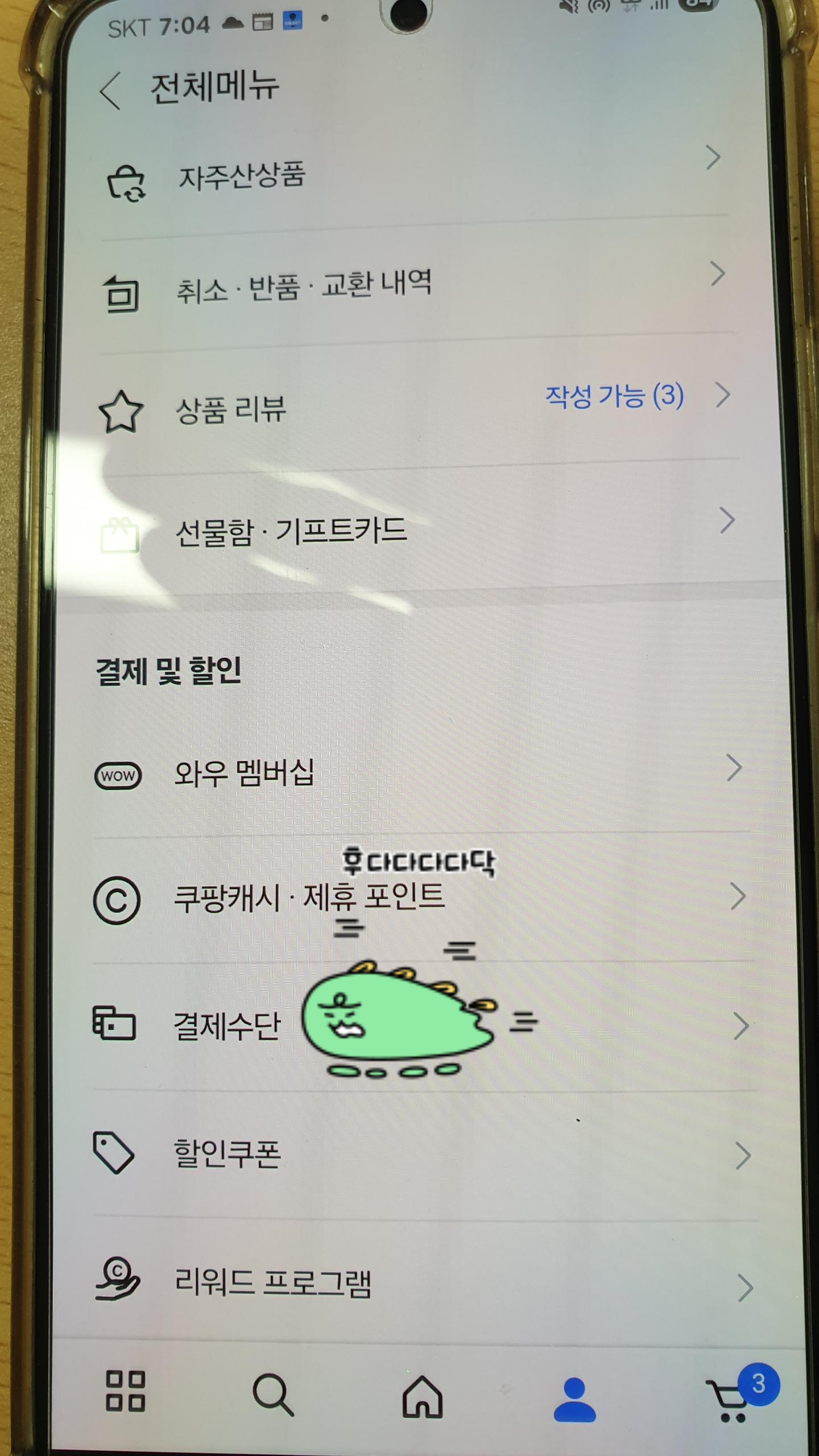 스마트폰에서 쿠팡 앱을 실행시키고 나온 화면의 우측 하단부의 사람 모양 터치합니다.